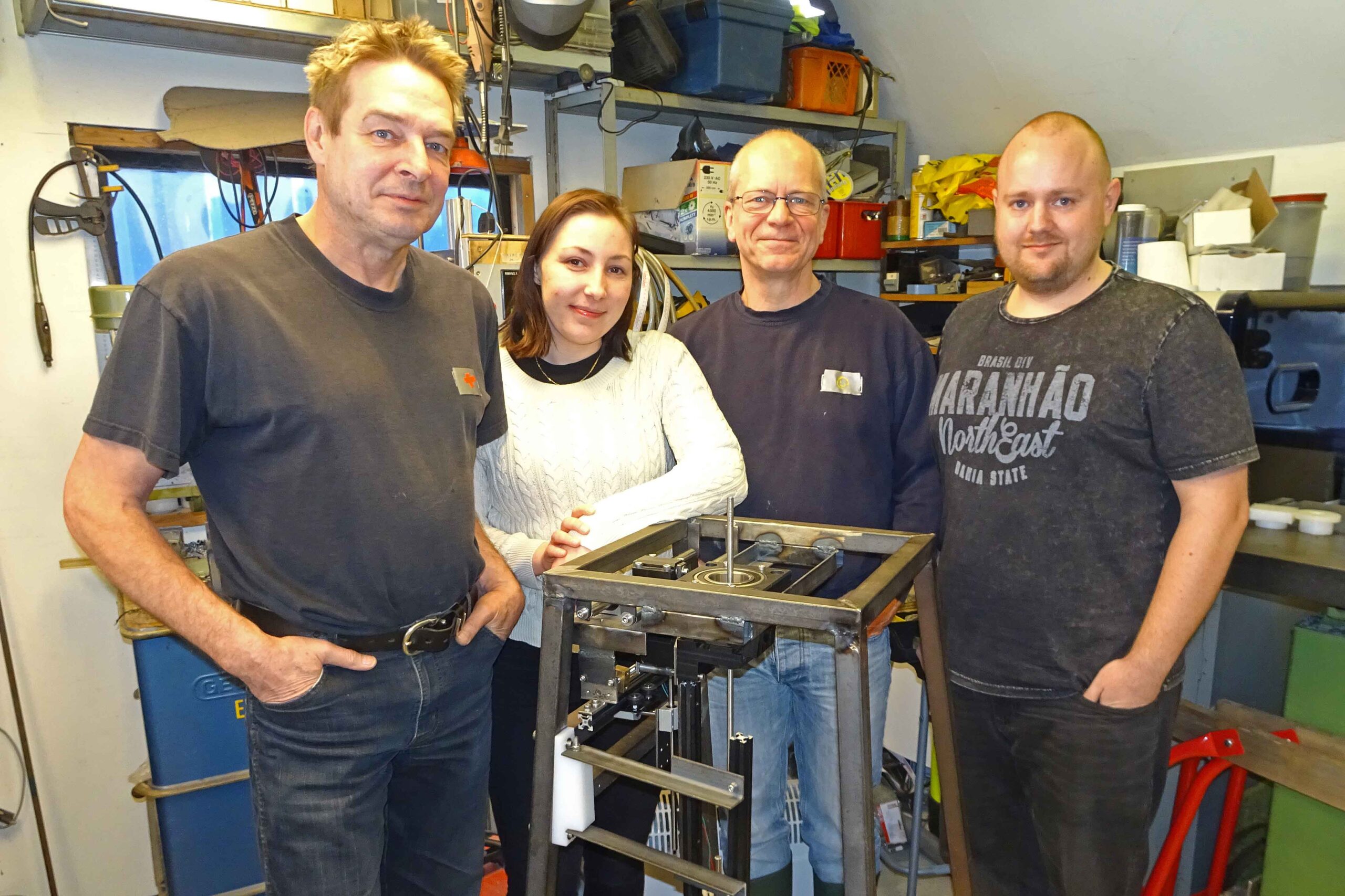 Hjemme på Henriks værksted har Henrik Egholm Andersen (stående) og Lars Lemming i de sidste par år nørdet sig frem til det apparat, som de nu går på markedet med.