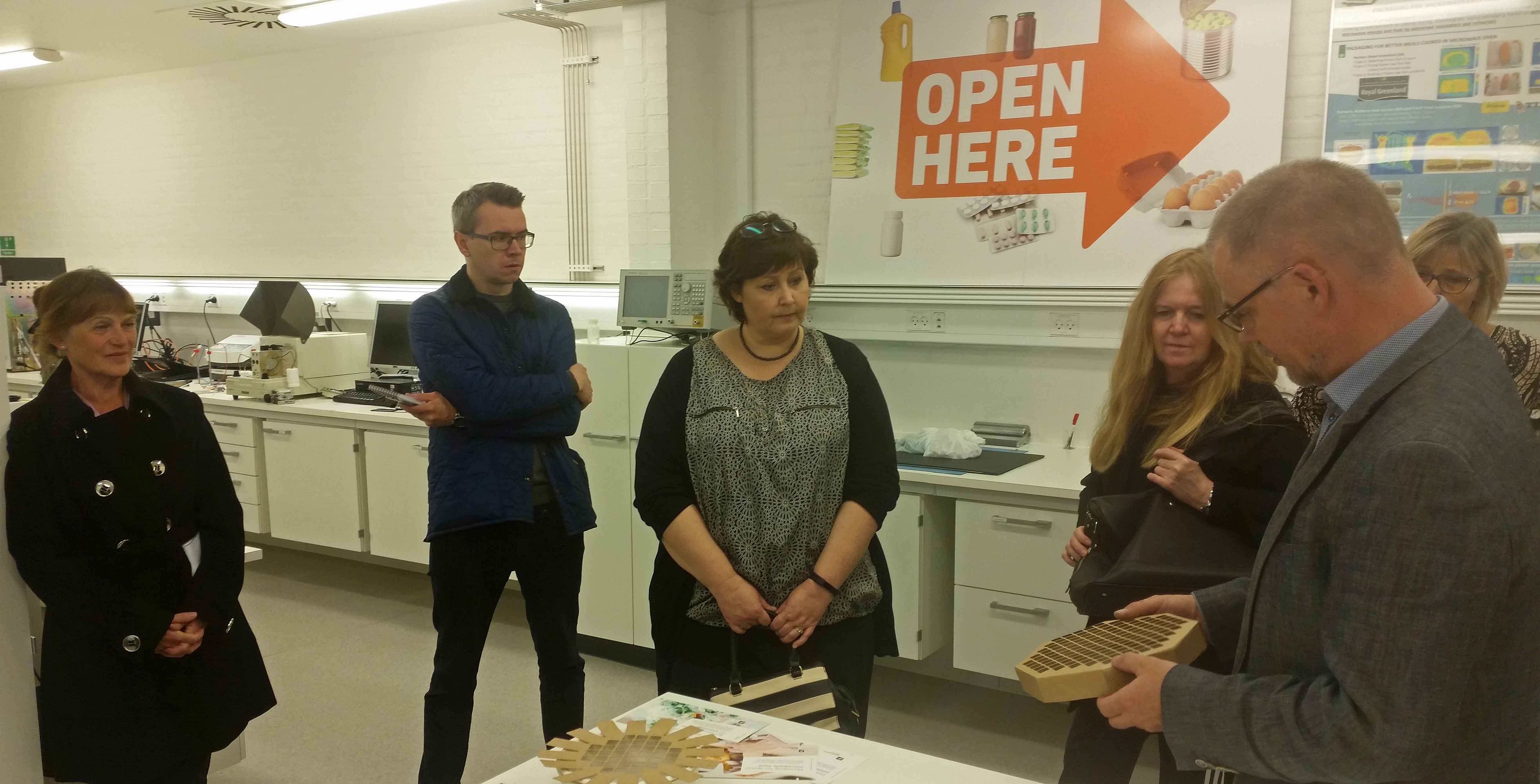 Undervejs besøgte vi fem af instituttets centre, nemlig Plastteknologi, Emballage & Transport, Fablab TI, Rørcentret og Betoncentret. Her hørte vi blandt andet, hvordan teknologisk Institut arbejder med genbrug af plast, simulerer transportsystemer, hjælper opfindere, arbejder med klimasikring i kloakrørene og udvikler betonvægge, hvor dagslyset kan trænge igennem ved hjælp af indstøbte lysledere.