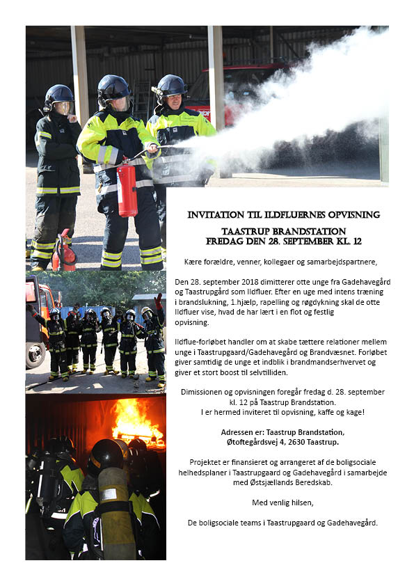 Alle medlemmer af Erhvervsforum er velkomne til at overvære opvisningen og få mere at vide om Ildflue-forløbene, som de boligsociale teams i Helhedsplanen Det spirer i Gadehavegård (selv medlem af Erhvervsforum) og Helhedsplanen Taastrupgård plus Helhedsplanen i Ishøj gennemfører i samarbejde med brandfolkene i Taastrup.