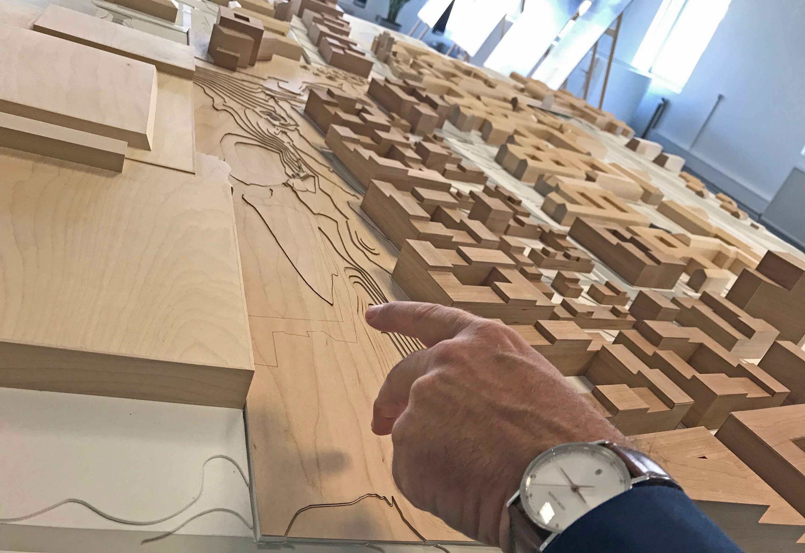 Direktør Lars Bloch med et udsnit af modellen over Høje Taastrup C (de mørke bygninger), der placeres mellem Den Gule By (i forgrunden) og City2 (til venstre i baggrunden).