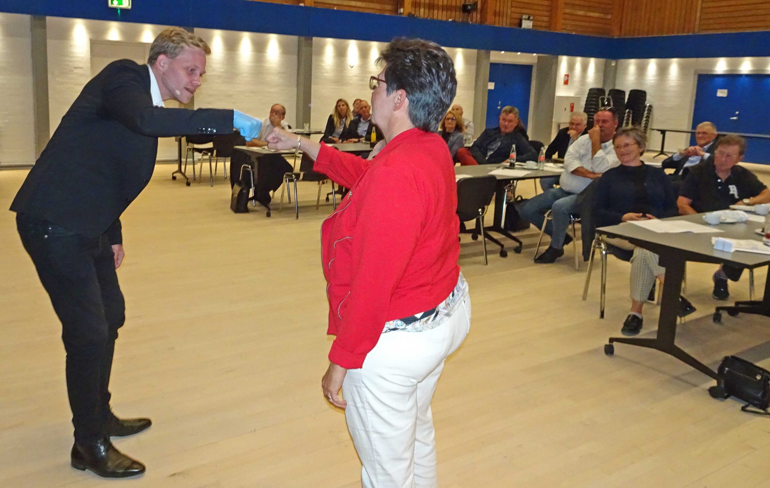 Et af de vigtigste signaler er håndtrykket (vælger du overhånd eller underhånd?), men det er jo udelukket i disse tider. Albue, fistbump (se foto) og hilsen med fødderne er udmærkede alternativer, forklarede Marc, mens hans flittigt demonstrerede dem på forskellige af generalforsamlingens deltagere.
