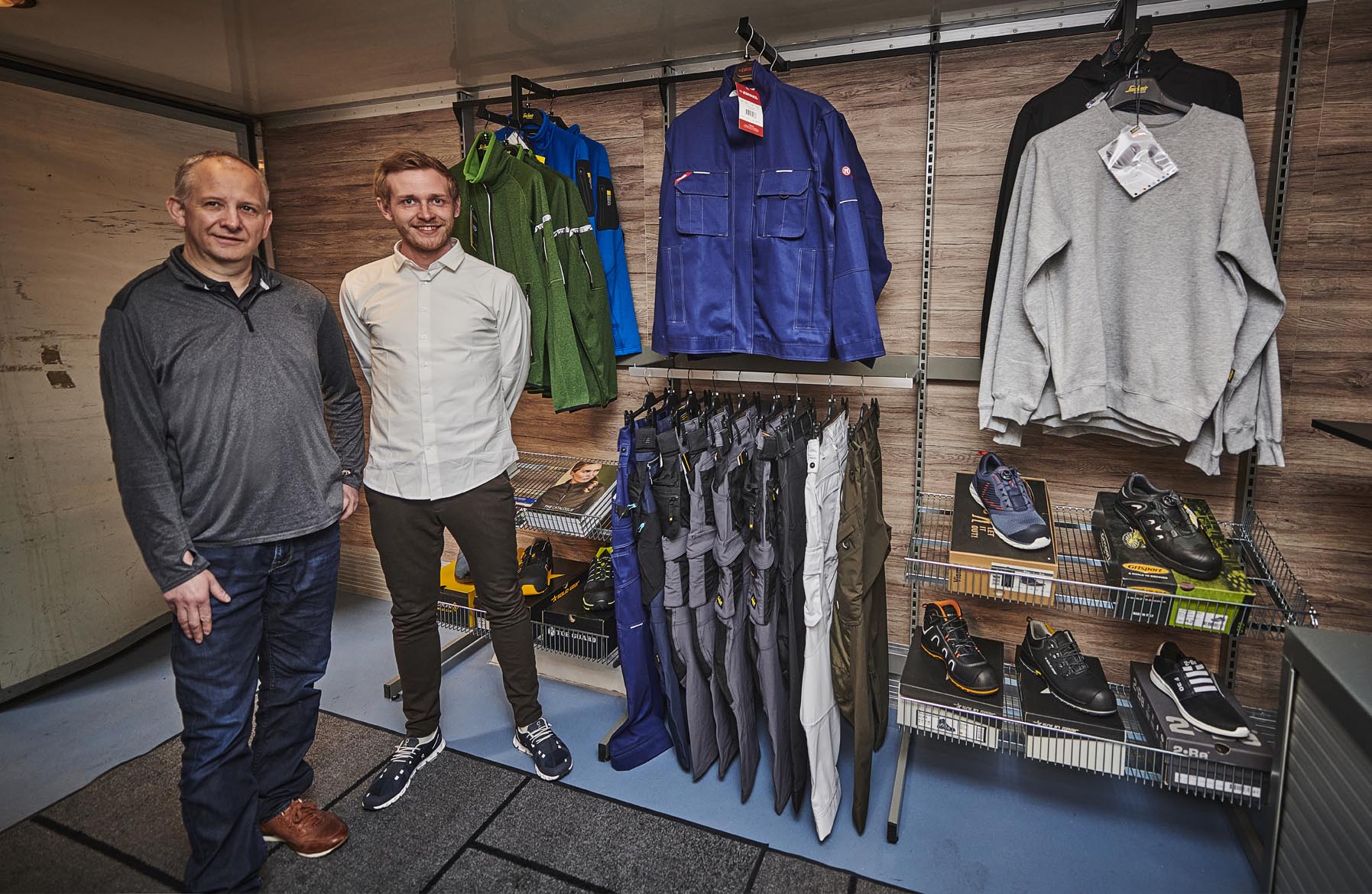 – Og det, vi ikke kan have med i bussen, har vi altid her på adressen, hvor vi opbygger en stor fysisk butik, fortæller salgschef Nichlas Kento. Her har vi blandt andet kendte mærker som Engel, Snickers og Carhartt og sikkerhedsfodtøj fra vores nabo Bjerregaard Sikkerhed og Airtox Industries A/S.