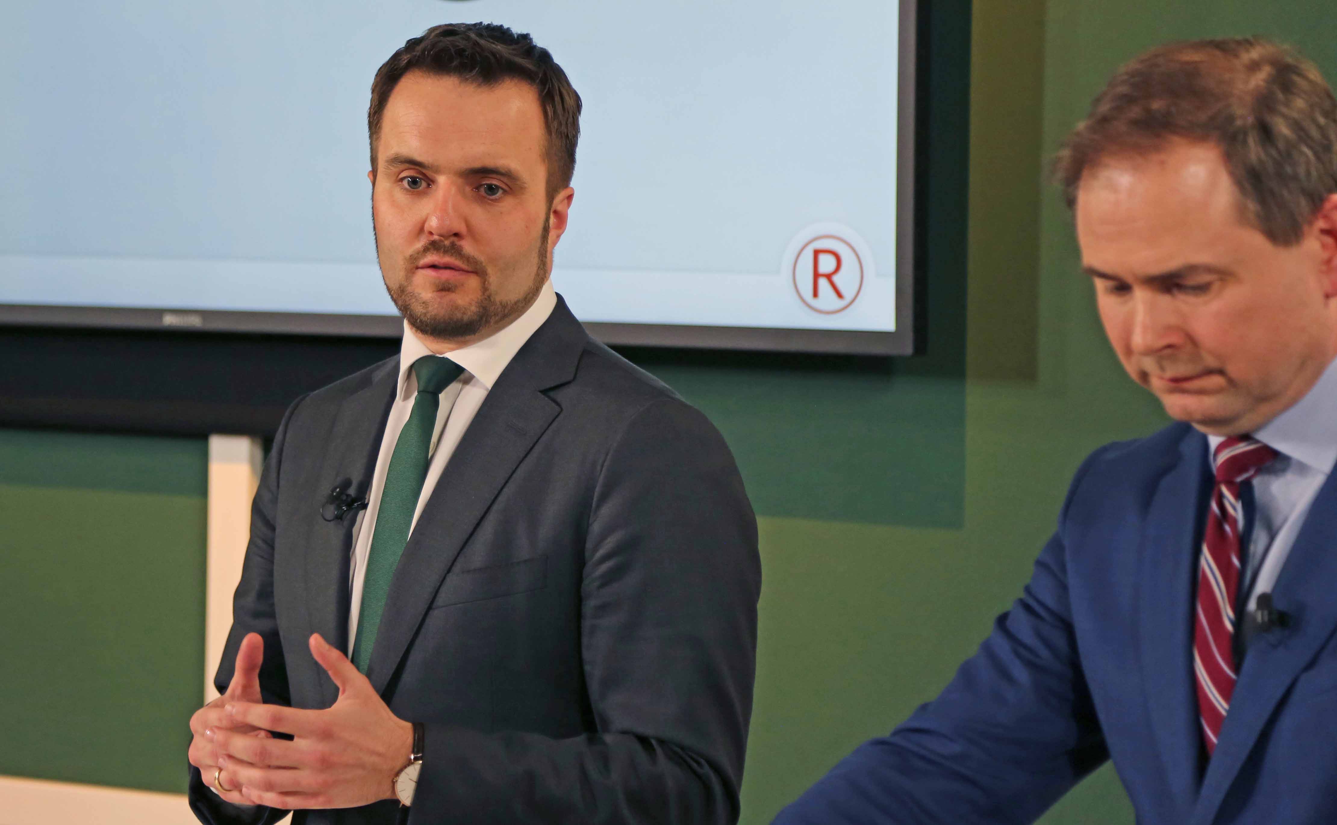 Erhvervsminister Simon Kollerup (t.v.) sammen med finansminister Nicolai Wammen til pressemøde om regeringens hjælpepakker.